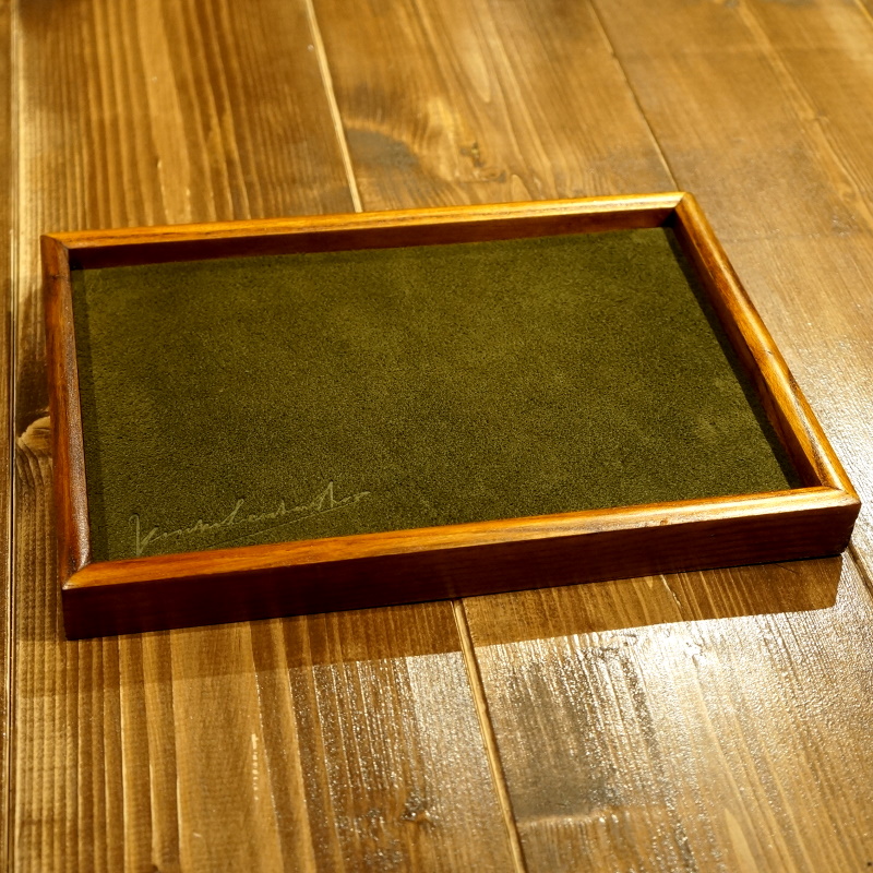 天然木と4mm厚のスエード革で仕上げたアクセサリートレー。KIZUKI LEATHER SHOPで購入しました。