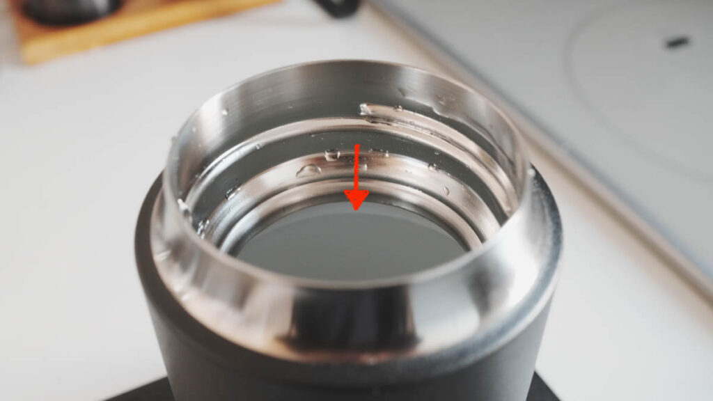 230mlの液体を入れると、ちょうど上の画像の位置くらいまで入ります。タリーズのショートサイズはおそらく240ml程度ですが、10ml程度オーバーしても問題なく蓋を閉められるくらいの余裕がありますね。