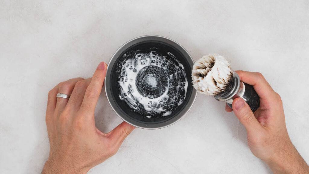 濡らした顔に直接塗り広げてもいいし、ブラシにつけて顔で泡立ててもいいですが、僕はラザリングボウルを使用しています。